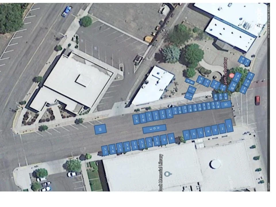 Above is a map of the general area of where the market takes place on both Tuesdays and Saturdays! Below is a representation of the booth spots on Saturdays ONLY! Tuesday market days is much smaller and takes place up on the sidewalk area in Max Square! Any questions, please see your Market Manager or the Info Booth!